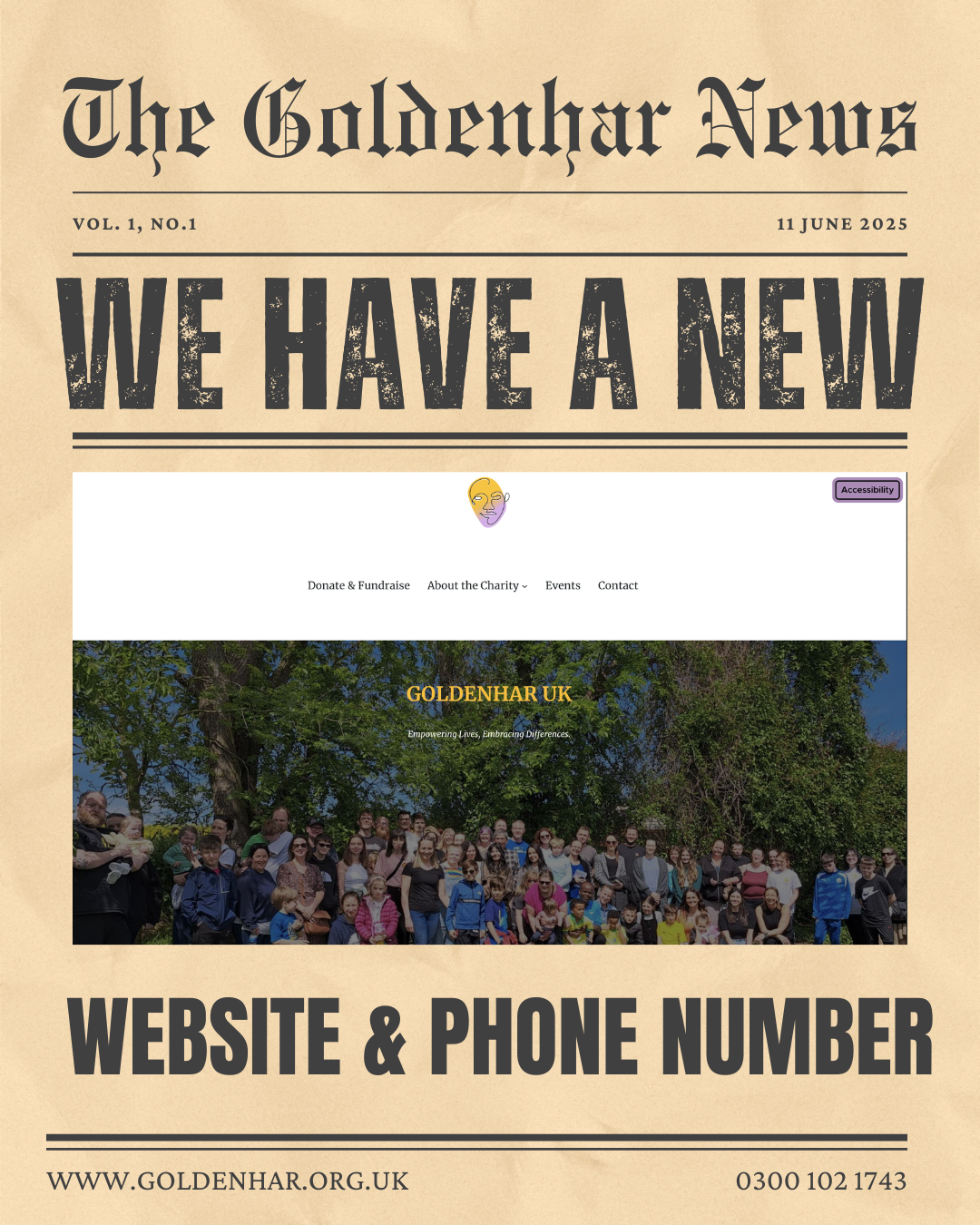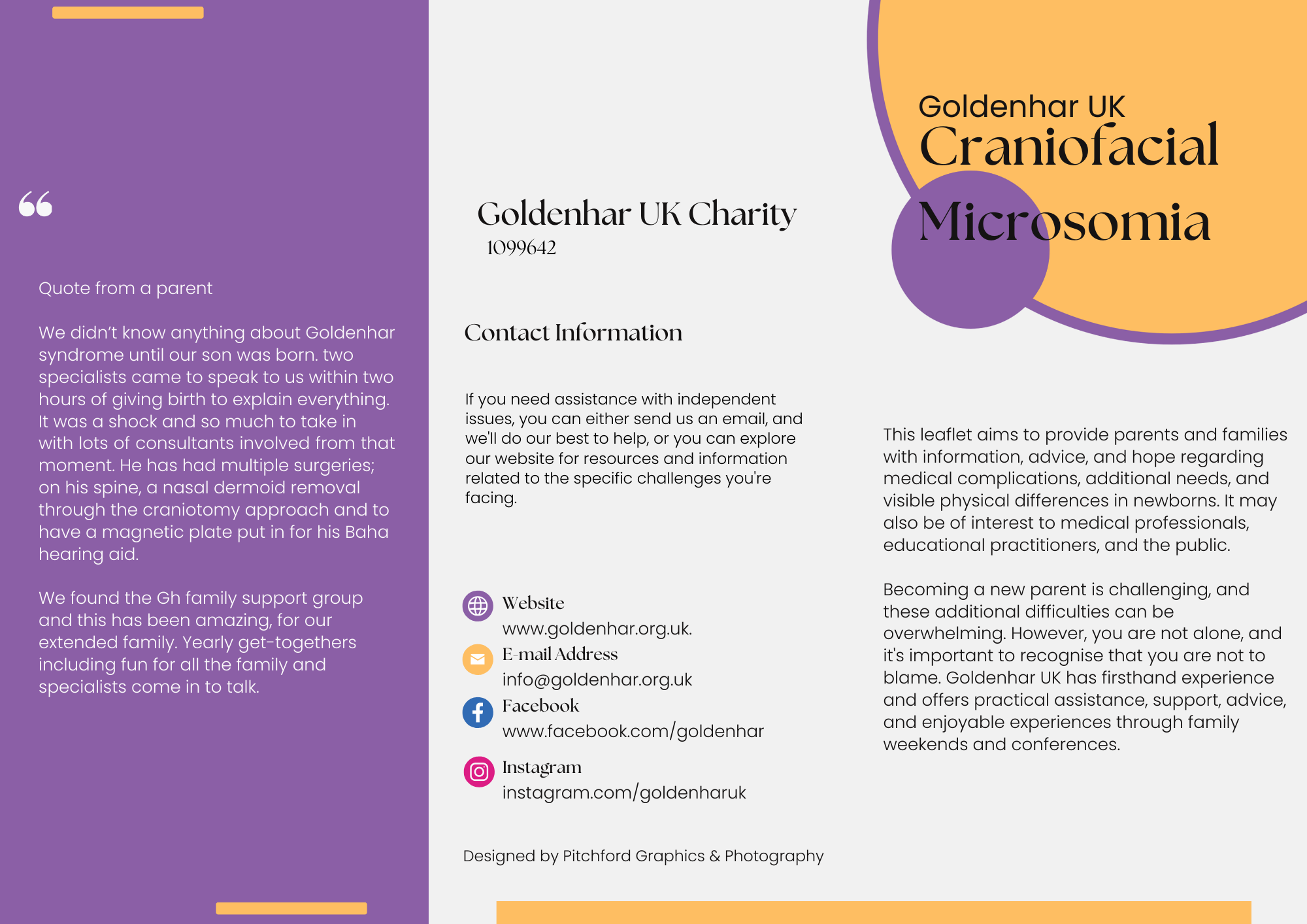 With Goldenhar UK, I work very closely on an ongoing basis. I redesigned and rebuilt their website, which had not been updated since 2010, bringing it up to date in both structure and accessibility. I also provide event photography, including imagery used on the hero section of their Facebook page, and design a wide range of materials such as posters, banners, leaflets, and other promotional assets. Additionally, I manage their website and social media channels, supporting the charity’s communications and ensuring visual consistency across all platforms.