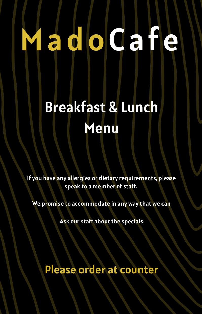 For Mado Café, I redesigned their menu and business cards, along with a range of additional materials including free meal vouchers for raffles, custom timesheets, loyalty cards, and other supporting assets. I also took over management of their social media following the departure of a staff member. In addition, I was asked to improve a promotional notice for a knitting group that uses the café space, known as Nostic Nitters, helping to present the group more clearly and professionally.